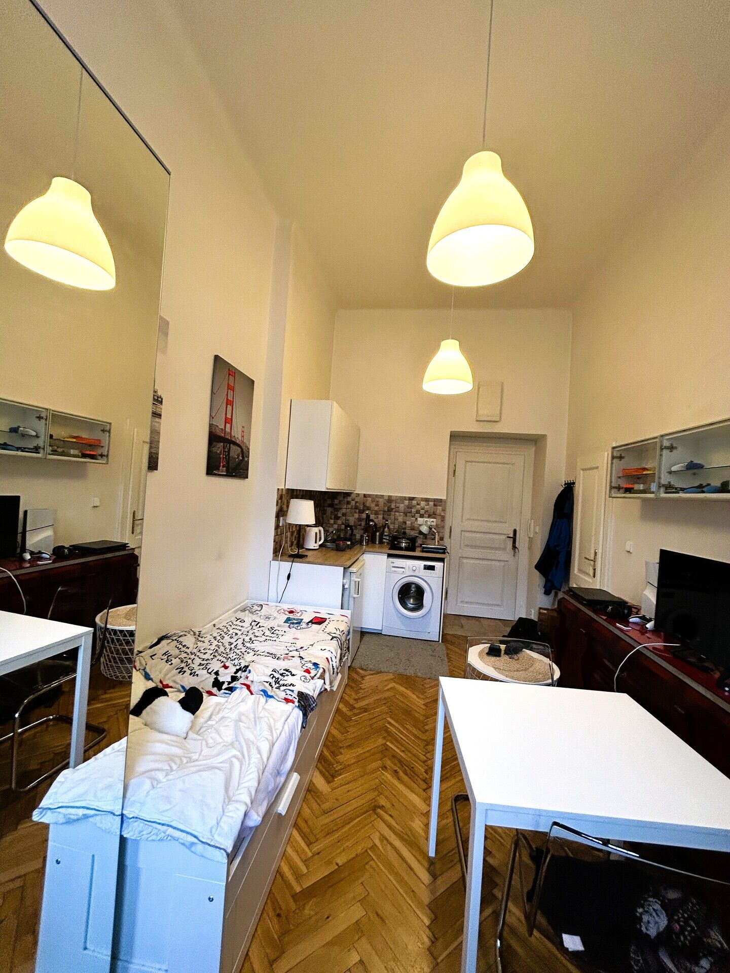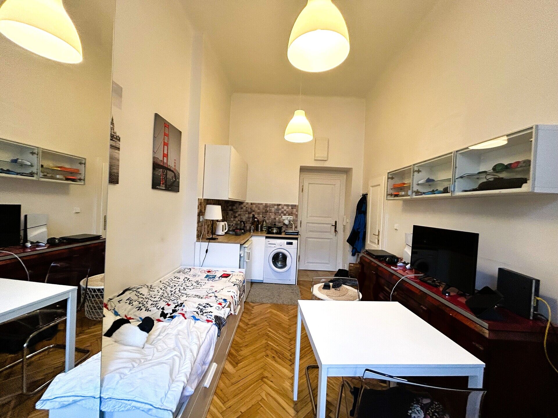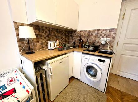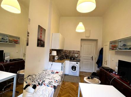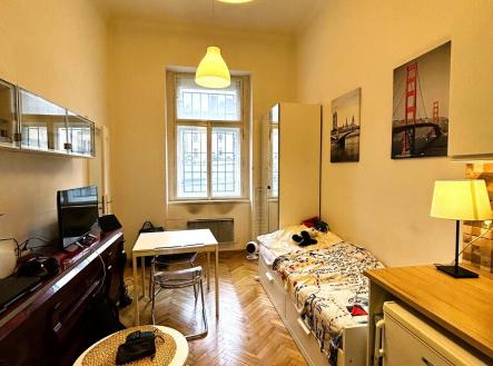 Nabízíme k pronájmu krásný, slunný byt 1+kk, 18,5 m2 v 1. NP činžovního domu bez výtahu. Byt disponuje pokojem s kuchyňským koutem orientovaným do vnitrobloku, koupelnou a samostatnou toaletou. V koupelně se nachází umyvadlo, sprchový kout a elektrický bojler, který zajišťuje ohřev vody. Kuchyňská linka je vybavena elektrickou varnou deskou, lednicí a pračkou. Byt je částečně vybaven (jednolůžková postel, skříň, komoda, stůl + židle, TV a další drobný nábytek). Na podlaze v pokoji se nachází dubové parkety. Vytápění bytu je zajištěno elektrickým přímotopem.
